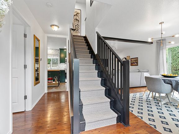 Stylishly updated newer construction in desirable Woodlawn. Quartz counters and updated cabinets throughout, including kitchen, laundry and bathrooms. Extensive hardwood floors, including all four bedrooms, living and dining. Light-filled from large windows. Modern floor plan with living room open to kitchen and dining. Main floor bedroom with attached full bath, plus three additional bedrooms and two additional bathrooms upstairs, including primary bedroom suite with walk in closet and updated quartz vanity with double sinks. Rare attached garage conveniently located off back hall to laundry and kitchen, and loads of guest parking on long driveway. Private, secure, gated lot with entertaining-size patio in yard. Three quiet blocks walk to Dekum Triangle and easily walkable to Safeway and Walgreens. Walk score 82, very walkable, bike score 97, biker's paradise. [Home Energy Score = 5. HES Report at https://rpt.greenbuildingregistry.com/hes/OR10225553]