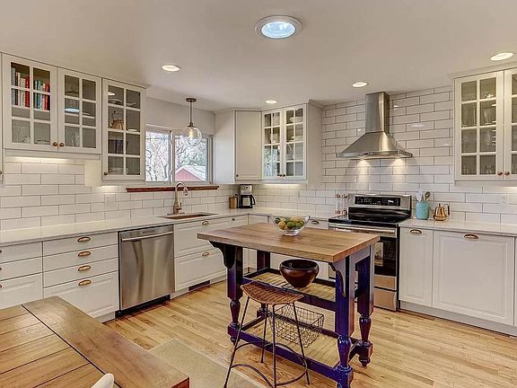 This gorgeous home on a large corner lot features a gourmet kitchen with beautiful cabinetry, quartz countertops, wine bar, stainless steel appliances, wood floors and recessed lighting. The kitchen opens to the dining and living areas with a walkout patio. The main level also includes three bedrooms and two bathrooms with modern designer finishes. The basement boosts lots of living space with reclaimed wood, office nook, two bedrooms (non-conforming), a stylish updated bathroom with stone tile and rainfall shower head, walk-in laundry area with sink and folding area, and plenty of storage space. The lush backyard features new wrought iron fence, treated cedar fence, large grassy area, patio, pond, lights, covered grill area, storage shed, retaining wall, planter boxes, and swing. Pre-wired for AV, Wi-Fi light switches, and Smart Pad wall charger. New furnace and air conditioning unit with humidifier, new hot water heater, new carpets, garage and RV/Trailer parking.