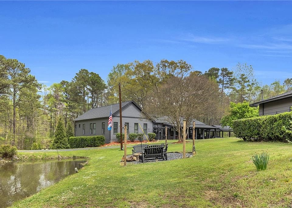 Discover this unique gem offering over 3 acres of serene, private land with a beautifully renovated ranch home, just minutes from Downtown Atlanta, Truist Park, and close to the Atlanta airport. This charming residence combines the tranquility of country living with the convenience of city access. Featuring 4 bedrooms and 3.5 bathrooms, the home includes a spacious primary ensuite with 10+ foot ceilings, a second ensuite with a newly renovated bathroom, and two large secondary bedrooms, each with walk-in closets, sharing a Jack-and-Jill bath. The kitchen boasts marble countertops and stainless-steel appliances and flows into the living spaces with gleaming hardwood floors throughout. A second family room provides additional space for relaxation or flex space. Step outside to enjoy the peaceful surroundings, whether by the firepit next to the private, spring-fed pond or relaxing on the covered front porch. The entire property is fenced for privacy, with automatic entrance gates at either end of the horseshoe driveway and an electric fence for pets. The property also features a nearly-new roof and exterior paint, a two-car detached garage, a chicken coop, fruit-bearing trees, and a renovated shed, currently serving as a personal speakeasy, which offers an ideal spot for entertaining guests.