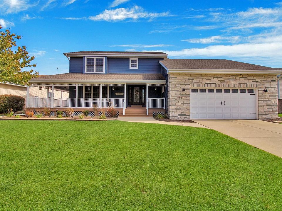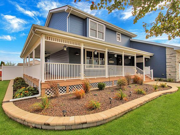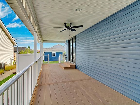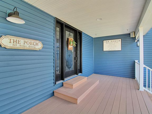 Stunning 2 story custom built home with numerous upgrades! The composite wrap-around porch has ceiling fans to circulate the air on those warm summer nights and retractable shades in front to provide you with shade on those sunny afternoons. The open concept kitchen and dining area flows into the great room that has a vaulted ceiling, recessed lights, and a floor to ceiling gas fireplace flanked with stone. The main level has hardwood flooring with custom cherry inlays. The kitchen has quartz countertops, black stainless appliances, farm sink, crown moldings, & custom built drawer organizers and cabinets with slide outs. From the formal dining room, there are leaded glass doors that lead out to the wrap around porch and another set that lead to the formal living room.. The master bedroom suite has an attached master bath with a large whirlpool tub, a walk in closet, and a ceiling fan. Extra large garage has attic storage with plywood. 9 ft basement ceiling with rough in for a bath.