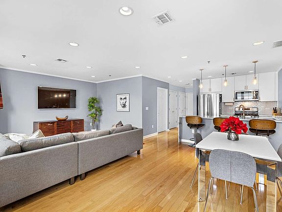 Welcome home to your rare and stunning downtown top floor duplex in a concrete + steel construction build! With 1,536 sq ft of living space, this 2-bed, 2.5-bath unit boasts hardwood floors, whole house water filtration system, 60 sq ft storage space/closet, central A/C, in-unit washer and dryer, recessed LED lighting w/ dimmers and TWO dedicated tandem parking spots. Builder grade windows have been replaced with Anderson windows. The recently renovated kitchen features sleek, slow-close cabinetry w/ a solid quartzite countertop (stain, heat, fire, scratch resistant), glass tile backsplash, stainless steel appliances including a new refrigerator, dishwasher and microwave, plus a breakfast bar. The custom-finished walk-in pantry provides ample storage. The 1st floor bathroom boasts custom LED mirror with backlight and dimmer, quartz countertop + a custom floating vanity. Shower head has air induction technology and a handheld attachment provides a luxurious experience. Upstairs are two generously sized bedrooms w/ fully renovated bathrooms, a custom-finished linen closet + in-unit washer/dryer. Primary bedroom features a custom walk-in closet. Primary bath boasts a heated floor, imported tile, soft-close medicine cabinet w/ LED mirrored doors, quartz countertop and a custom floating vanity with soft-close doors + drawer. The rain shower head offers induction technology + handheld attachment provides a spa-like experience. The high-end Toto smart toilet has a bidet + seat warmer. The second bedroom features a custom walk-in closet, an ensuite fully renovated half bathroom with imported tile, LED soft-close medicine cabinet w/ mirrored door, quartz countertop + floating vanity w/ soft-close doors. Building amenities: renovated hallways, fitness room, common rooftop terrace + courtyard, sleek lobby + ButterflyMX Intercom video security. Easy NYC access w/ a short walk to PATH, ferry, NJ bus/trains + light rail. Parks, schools, daycares, shopping + dining nearby.