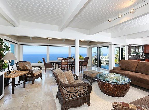 Incredible panoramic ocean views await at the end of a quiet cul de sac in the coveted Portafina neighborhood. Sit down ocean views from virtually every room with unobstructed north coast, south coast, Catalina and San Clemente Island views. Hear and see the waves crashing on Victoria Beach. Sunsets in the ocean every night. An open floor plan with travertine flooring flows outside to the covered patio. This connects to an expansive wood deck with even more amazing views. Perfect for entertaining. The remodeled kitchen flows seamlessly into the family room and dining room offering top-of-the-line Viking and Miele appliances. Retreat upstairs to the approx. 700 sq. ft. elegant master suite with more sweeping ocean views, walk-in closet and full-size updated master bath with deep soak tub and dual vanity. Nearby hiking/biking trails, tennis courts and basketball along with Moulton Meadows Park complement this classic Laguna neighborhood. Short distance to beaches, shopping centers, and downtown. For those looking for serenity and awe-inspiring views, this is the one. Without a doubt, this is the best bang for the buck in terms of view, dollars/ft, overall value in Laguna.