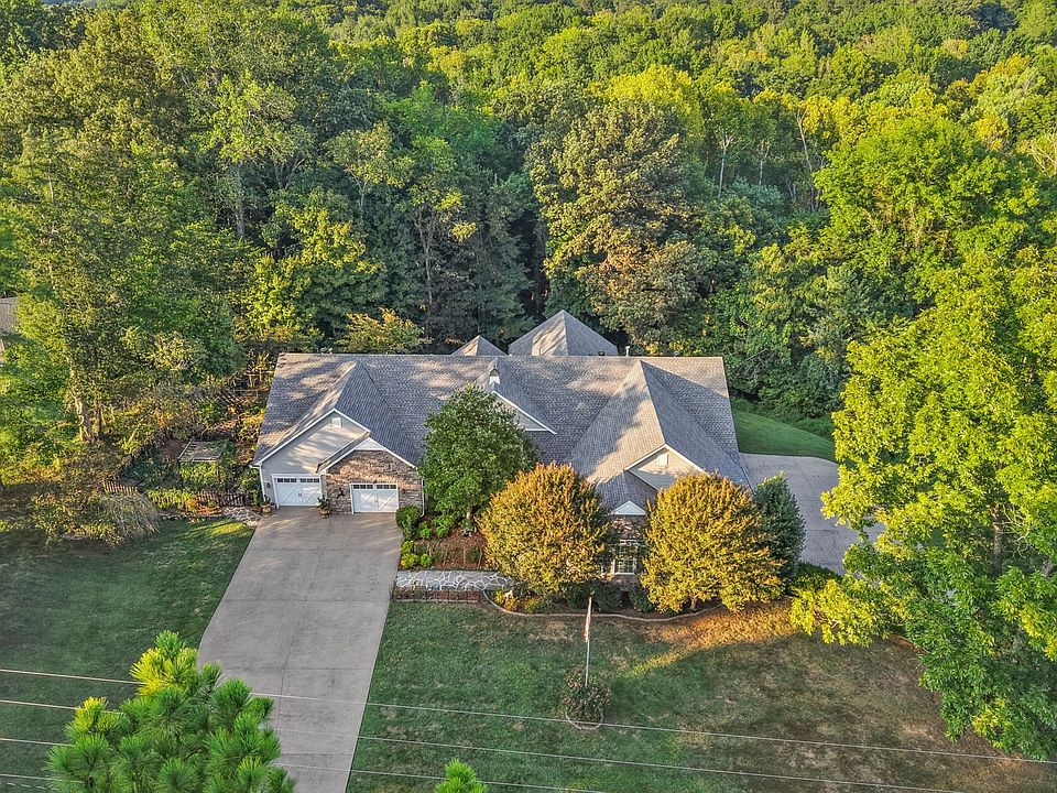 TOTALLY CUSTOM & EXTREMELY RARE RANCH style home on nearly 5 ACRES nestled at the end of a quiet cul de sac with no HOA and no thru traffic. The expansive 3,500 sq/ft main level offers 4 bdrms, lg den, formal dining rm, a 1/2 bath off the kitchen, and 6 CEILING FANS!! Hardwood oak floors throughout living, dining, and bdrms. Spacious living rm features vaulted ceilings. The massive tiled kitchen includes a walk-in pantry, abundant cabinets, lg island with high-end gas stove/range, and excellent storage. An incredible oversized tiled FLORIDA ROOM offers full heating & cooling with 360° views of the forest and wildlife. The primary suite features vaulted ceiling w/beams, dual walk-in closets, oversized tub, separate shower room, and dbl vanities. Two guest bdrms share a Jack & Jill bath with oversized tub. Upstairs includes a bonus rm with full bath, 2 bdrms (one ideal as office), 3 lg closets, and walk-in attic access. Lg main-level laundry rm w/washer & dryer space, built-in wash sink, and storage. Custom windows & frames throughout. GARAGE SPACE FOR 5 VEHICLES: front driveway leads to 2 upstairs bays w/new garage motors; 2nd driveway leads to 3 oversized bsmnt bays with tall doors, high ceilings, and storage—ideal for trucks, boats, RVs, or workshop use. Walk-in crawlspace, handicap accessible entry from garage w/no steps, and multiple storage areas throughout. Tankless water heater installed in 2024. $45,000 invested in roof, gutters, and soffit replacement in 2024 plus new fence in 2024. Outdoor features include koi pond, rose bushes, organic garden, dog run off bsmt, and private backyard. City sewer connection (not septic). Prestigious neighborhood near Dunbar Cave and Swan Lake Golf Course. Immaculately maintained. RECENT PRE MARKET HOME INSPECTION ON FILE—no surprises!