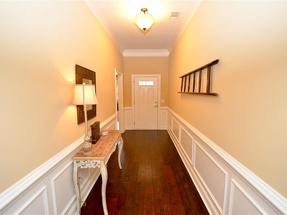 One level home with hardwoods, crown molding, recessed lighting, tankless water heater. Large Master Bedroom features tray ceiling and carpet. Master Bath includes double vanity, linen closet, garden tub with tile surround, spacious shower and HUGE closet. Large Dining Room opens up to Living Room, which features gas fireplace and tray ceiling. Kitchen has granite counter tops, stainless steel appliances, upgraded Tapioca cabinets & mosaic back splash. Large, airy Breakfast Room off of Kitchen. Laundry Room has additional cabinet space. Covered patio overlooks the private, fenced backyard, which backs up to the woods and has a walking trail that leads to the lake.