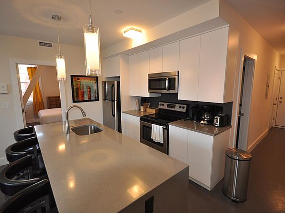 This massive two bedroom, one bathroom apartment balances the historic character of the original industrial building with the contemporary modern finishes and amenities. The unit has high ceilings, exposed concrete floors and is equipped with the latest in urban utilities. This large two-bedroom apartment features a beautiful kitchen equipped with all new stainless steel appliances, granite countertops with waterfall ends, a garbage disposal, a dishwasher and a bar roomy enough to seat three. The living space is located at the rear of the building which is nice and quiet and is filled with beautiful southern sun. There is exposed brick in the entryway. The unit also has direct access to the exterior via an external stair where one can enjoy a morning coffee outside. The apartment has a private washer and dryer, central heating and air conditioning. The unit is also furnished with an on demand gas fired hot water heater as well as a high efficiency boiler. Parking is available at an additional cost.