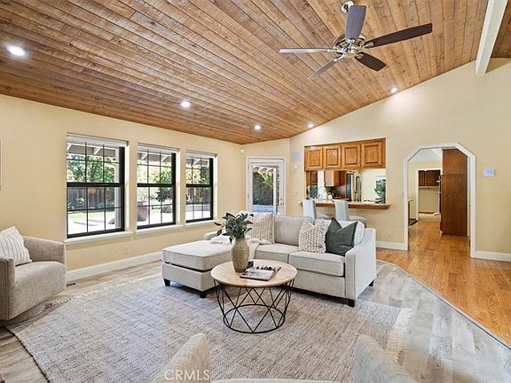 This updated home is complete with OWNED SOLAR and a NEW ROOF last year! Tucked away on a cul-de-sac street beneath the shade of tall, beautiful trees, this home is sure to please! The kitchen has beautiful stainless steel GE Cafe appliances, granite countertops, a butcher block island with a five-burner cooktop, and there is so much cabinetry for ample storage! I don't know when I've seen a large laundry room like this that offers so much storage and convenience! The exit door allows people to come in from the pool and use the half bath off to the laundry room. This home offers both a living room with a fireplace and a separate family room that has a gorgeous wood-line ceiling and a beautiful view of the backyard with a sparkling pool. As if that's not enough, your primary suite has vaulted ceilings and a private exit to the backyard. The ensuite bath has a beautiful dual sink vanity with a beautiful solid surface countertop and a gorgeous step-in shower. Three more bedrooms share a wonderful bathroom off the hall, with two separate vanities and a private water closet. You'll love the solid surface flooring throughout. The backyard is the perfect place to entertain with its expansive patio, mature landscaping, and a gorgeous POOL that has been recently updated. The plaster lining has been resurfaced, a new water feature added, and new tile. A pool heater is available but not hooked up. And to top it off, there is RV PARKING behind the gate with an electrical hookup.
