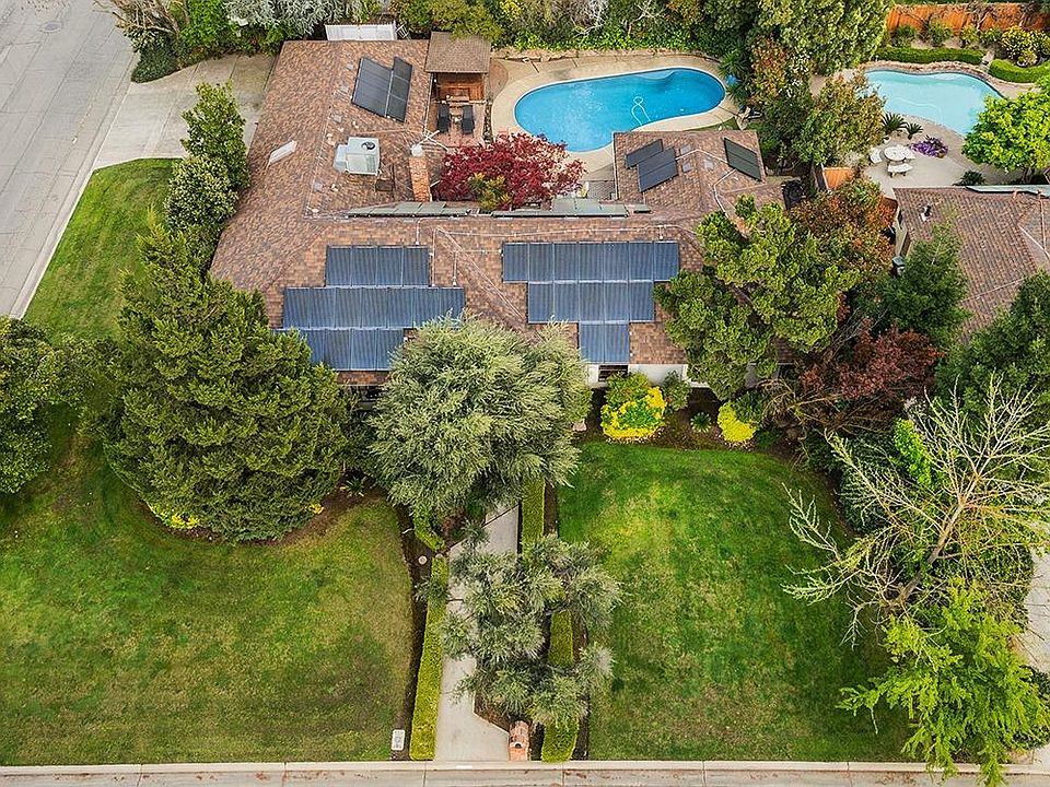 Tranquility, peace, and harmony best describe this lovely resort-like estate. Well balanced on its .32 acre lot. 5 BR 3 BA (with marble counter tops). This home is in the Bullard High area. This Zen home features a front entry with authentic Mexican Saltillo tile and vaulted ceiling to floor double windows encasing a Koi Pond, that is the center of this home. With, 2 living areas, living room with full mirrored wall (can be used as a piano room or dance studio and a formal dining room, a great room with vaulted ceilings and more ceiling to floor windows, a sun drenched kitchen, white tiled counter tops, with double ovens, beautiful cabinetry, a breakfast nook, with bay window and a single French-door leading to the pool and extremely private tree lined backyard, hardwood floor throughout the house. The fifth bedroom is on the back side of the house near the beautifully tiled guest bathroom, and can be used as a mother- in- law suite. The ample master bedroom has a sitting area with French doors, leading to the backyard, and a master bath with walk-in closet. The sizeable backyard is private with a beautiful in-ground kidney shaped pool, above ground Jacuzzi, and a small golf putting green. The garage is a 2 car with a deep driveway, with side area for a third vehicle. Built in work bench. The house has 43 owned and 18 leased solar panels.Call your favorite realtor today to view this lovely corner home.