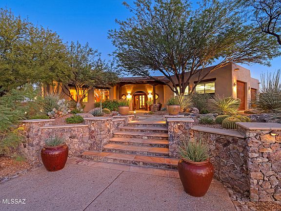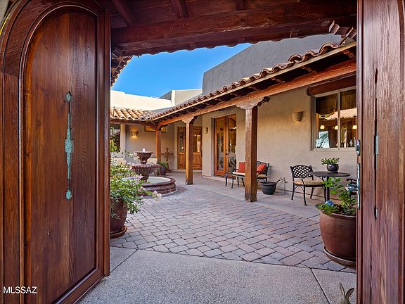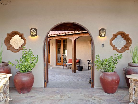 Range priced between $1,650,000 to $1,700,000. Breathtaking custom Santa Fe-style retreat, nestled on 7 acres of serene desert landscape w/ panoramic mountain & sunset views. This luxurious 4-bedroom, 4-bathroom home features a MOVIE THEATER w/ custom seating, a massive BONUS ROOM or GUEST QUARTERS w/ kitchenette/wine fridge, & lavish decor throughout. The elegant flagstone entryway leads thru arched wood doors to a bricked courtyard w/ fountain. Step inside to a a beautiful foyer, Travertine floors, crown molding & hickory doors throughout. The chef's kitchen w/ granite counter tops boasts top-of-the-line KitchenAid appliances, a gas range, breakfast bar & new microwave,oven & warming drawer. Incredible backyard w/ botanical garden like landscaping & walk around courtyard.. Outdoor kitchen & gorgeous pebble-tec pool w/ waterfall. Unwind in the primary suite, complete with a spacious walk-in closet & a private sitting area w/ incredible desert views. With two cozy fireplaces, custom draperies, custom painted interior & fine finishes at every turn, this home offers a blend of sophistication & warmth, perfect for those seeking privacy & luxury in the heart of nature. Recent updates include new reverse osmosis system, new soft water system, recoated roof w/ warranty, new kitchen appliances, newer dual HVAC units. List of extensive renovations completed since owner bought home available. Gated enclave w/ no HOA, near Saguaro Park and many walking trails, this one of kind home is a must see!! All furniture including patio furniture & decor is available. Can be completely turn key!