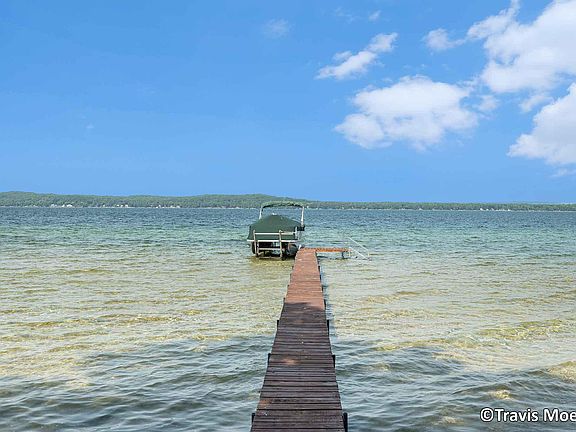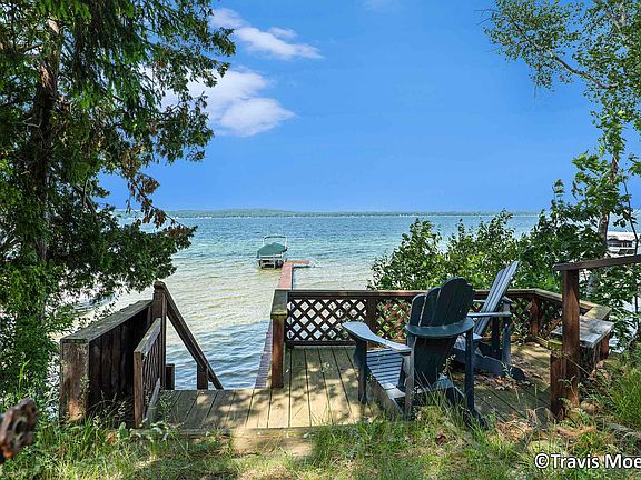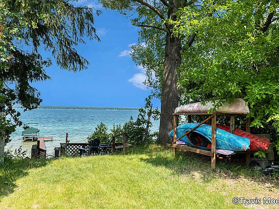 Fall in love with this light-filled and picturesque home with 20 feet of private water frontage. Big Platte Lake is Sleeping Bear area's best kept secret featuring crystal clear waters and great fishing. Here you will find yourself immersed in the area's beautiful amenities, renowned hikes, Lake Michigan beaches, and stunning water, forest, and dune vistas. Located on a quiet street, this 2 bed 2 bath, updated home, boasts views of the sparkling and clear blue lake and is just minutes from M22, the Platte River, and adjacent to Sleeping Bear Dunes National Lakeshore. Inside the home enjoy an open-layout with numerous windows, elegant coffered ceilings in the living room, a wallpaper feature wall, spacious kitchen with stainless appliances, and modern plank flooring and paint colors throughout the main floor. An ample sized primary bedroom with attached bath and second bedroom and full bath round out the main floor. Downstairs you will find a cozy, wood-clad den and second living space with a three-season sitting room. The well-kept and private backyard includes a deck, charming greenhouse and space for a garden. The dock is included so you can start enjoying the 2,500 acre all sports lake. Schedule your showing today so you don't miss out on your slice of Northern Michigan paradise! Showings begin Wednesday 6/21/23 and offers will be reviewed 6/28/23 at noon.
