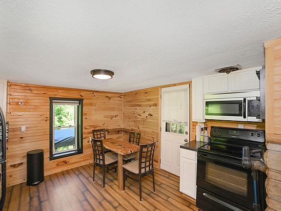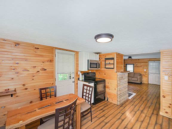 Living Room: Features a fieldstone fireplace with a wood-burning insert, adding to the cabin's rustic charm.