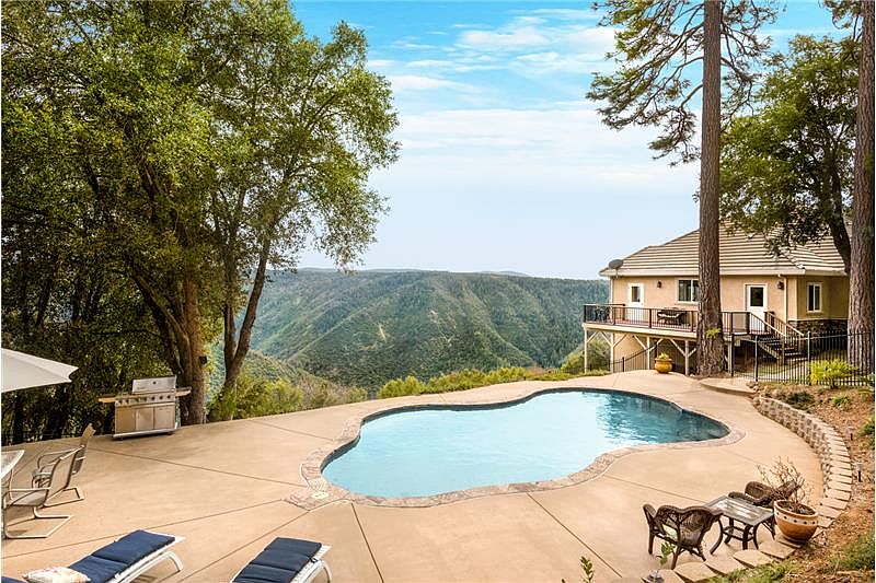 Simply stunning views clear to the Sierra snowcaps from this amazing home. Enjoy the peace, quiet, soaring birds and unbelievable night skies. One story living: kitchen, family, master, office & guest room plus 2 1/2 baths. Downstairs: two beds, bath, large bonus room plus den/exercise room. Open floor plan flows nicely, out to large deck and built in pool and VIEW! Owned 5.6 KW solar system! Wonderful small town living with lots to do in Foresthill! Pls watch video & see extensive description.