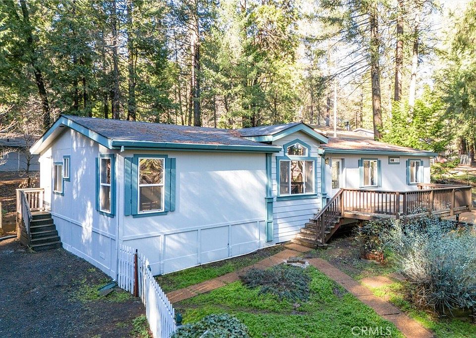 EXCEPTIONAL HOME WITH OUTSTANDING SETTING! This end-of-the-lane home sits on a nice 1/2-Acre parcel and has the tranquil feeling of living in the woods with gorgeous native pine and cedar trees with a generous deck overlooking the adjacent large parcels adjacent to Little Butte Creek and nearly to Paradise Lake and the Magalia reservoir. This 2003 modular home offers many great features in an attractive package. Some of the amenities include; new interior paint and carpeting, 4-Bedrooms, 2-Bathrooms, 1,653+/-SqFt, large great room open to the living room with vaulted ceiling, upgraded laminate flooring & ceiling fan, family room with laminate flooring & ceiling fan, dining area & thoughtfully updated kitchen with Corian type solid surface counters, newer stainless appliances & abundant cabinetry, large primary suite with new carpeting &ceiling fan, walk-in closet, en-suite bathroom with oversize soaking tun, separate shower & vanity with convenient access through to the indoor laundry room, Split bedroom floor-plan with three guest bedrooms on the other side of the home, each with a full sized closet and vaulted ceilings and a well-placed guest bathroom with tub-shower, large front deck with elevated views, big circular driveway, patio area, detached storage shed, raised garden beds & more. This well-kept home & property will give you that welcome feeling you’ve been looking for! Be sure not to miss all the great Recreational opportunities in close proximity including lakes, hiking, biking, fishing, ATV and dirt-bike riding, canoeing, kayaking and much more! Take a look at this tremendous property and you may decide to call this one HOME!