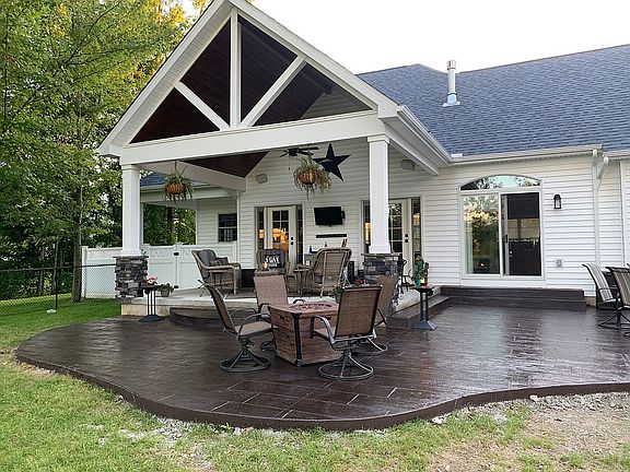 Open floor plan ranch with 2 sided fireplace, great room, hearth area off kitchen, dining room with butlers pantry. Large walk-in pantry. 1st floor laundry. Office, large master bedroom with master bath that has large walk-in shower. 2nd bedroom, full bath and dog room, huge covered front and rear porches. Stamped concrete patio and fenced yard. Private back yard with shed.