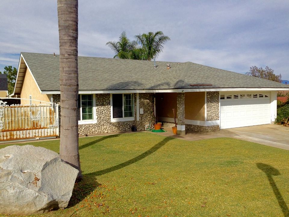 LARGE CORNER LOT. 3 bedroom/2 bath. Remodeled kitchen with newer cabinets, granite island, and new stove/oven. Large dining area with family room off kitchen. Vaulted ceilings, separate living room with fireplace. Central heat and air. Large landscaped backyard, fully fenced with covered patio. Gardener included. Non-smoking. Pets ok, submit. $4,125 income with 600 FICO to qualify. Call (951) 373-2500 to schedule a viewing.