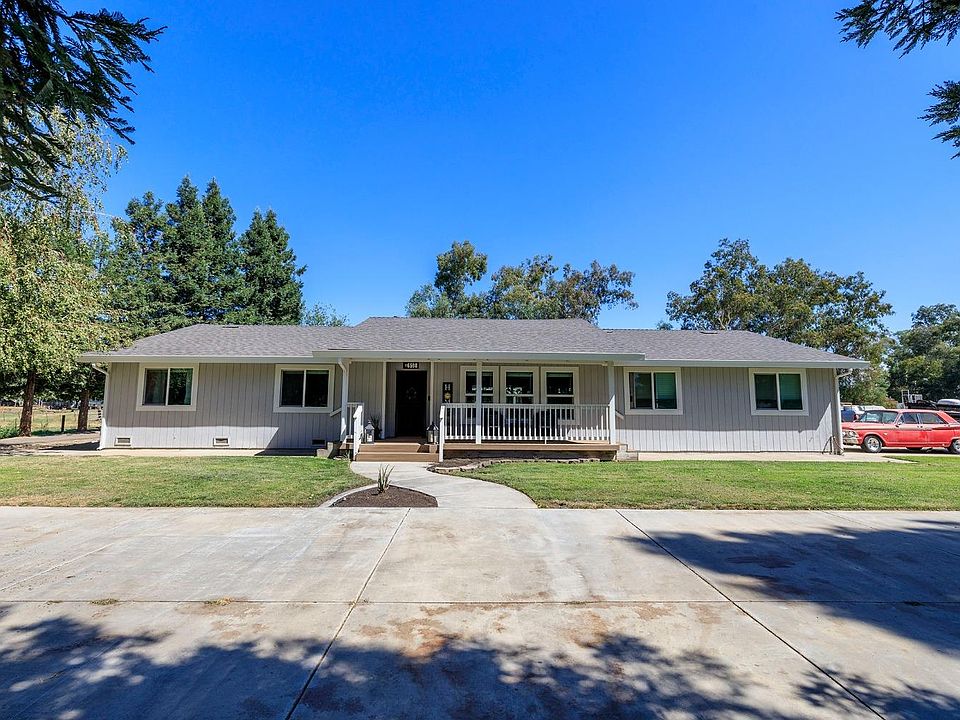 Very peaceful 2 acre ranchette is located on a dead-end street in Oakdale, California, home features an open floor plan and great room concept with vaulted/cathedral ceiling. Spacious kitchen with island, pendant lights, pantry closet, and solid surface counter tops. Three bedrooms plus a den/office, and 2 baths. Master suite has a large walk-in closet and access to the outdoor living area through French doors. Recently repainted exterior, newer roof (house & shop), newer windows, blinds, newer well pump, tankless water heater. Room for all your toys and animals. Huge 30' x 40' shop, with jib crane (3,500 lbs), 220 electric, cabinets, stove, sink, stove and loft storage. Two stall barn with tack room, pole (panel) fencing, fenced. It even includes a chicken coop and bunny hut! Outdoor entertaining area consists of deck, cozy firepit area.