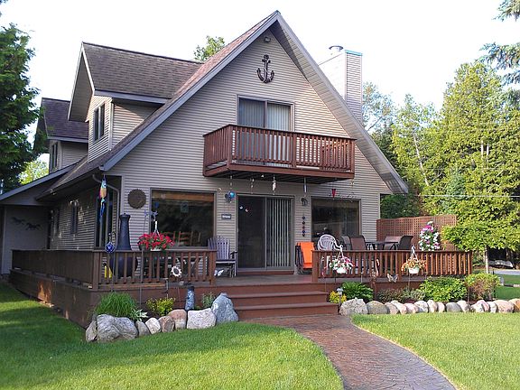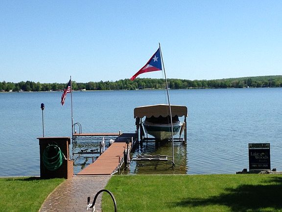Absolutely mint, move-in condition! Custom 4 bedroom, 2 bath home on Hubbard Lake with sandy bottom frontage. Beautiful Anderson windows with custom blinds and window treatments surround the living/dining/kitchen area with a fantastic view of the lake. Mohawk laminate wood, ceramic and Berber flooring throughout. Central A/C; central vacuum system. Attached 1-1/2 car garage with heat, electric, hot/cold running water, drain, attic storage, etc. Plus a 24x64 polebarn with lots of built-in shelf storage and wood stove. Manicured yard with privacy fence, custom stamped walkways from front to back, decking, parking area for guests and blacktop driveway. Automatic, whole-house, natural gas generator. Steel breakwall. Docks included. Impeccable; very well kept home where pride of ownership shines through! Must See to appreciate all this home has to offer!