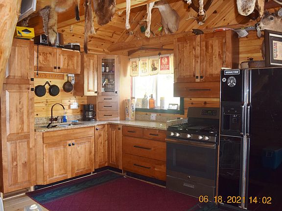 UPPER PENINSULA WATERFRONT GET AWAY or YEAR ROUND HOME 2 Bedrooms 1 Bath, Beautiful Custom Kitchen, Log Bar to Sit and Relax and take in the View, Natural Gas Stone FirePlace, Updates Include Cedar Exterior, Metal Roof, Newer Range, , 100 Amp Electric Service, Newer Well and Pump, Newer Water Heater, RELAX go Fishing or Snowmobiling, (located next to the trails) , Large Deck and a 1 Car Garage for the Toys