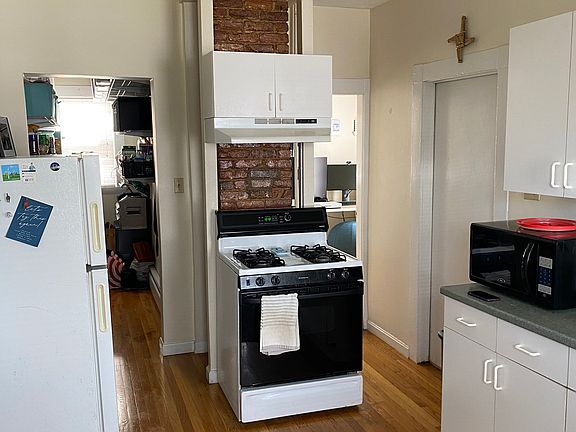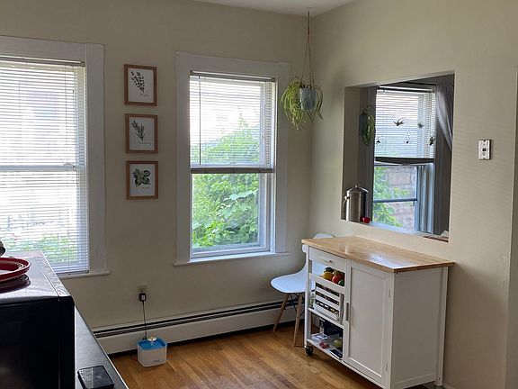 This bright and sunny apartment is located on the first floor of a 3 family and features beautiful hardwood floors throughout, high ceilings, large windows for ample sunlight, a semi open layout with gorgeous exposed brick connects the living area to the dining room and eat-in kitchen. 2 good sized bedrooms, one slightly larger than the other. Extra storage located off the kitchen, and even a small deck to enjoy the lovely New England weather. Laundry in the building 1 off street parking spot Cats only Available 4/1