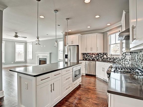 - Kitchen Features: Cabinets White, Island, Breakfast Bar, Counter Top - Stone