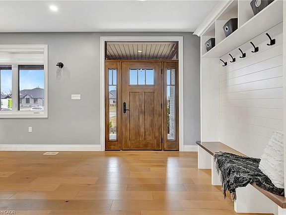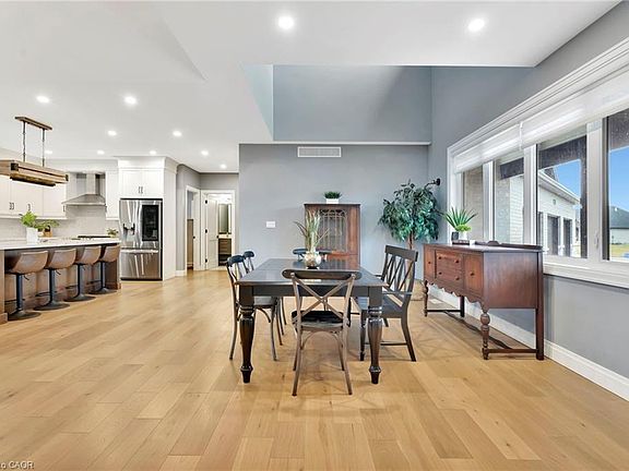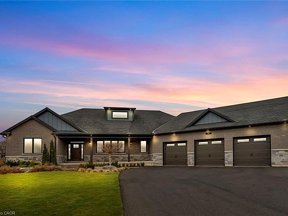 Set on nearly a full acre in a peaceful, upscale neighborhood, this stunning all-brick bungalow offers the perfect blend of luxury, comfort, and space. From the moment you arrive, the triple-car garage and oversized driveway set the tone for the elegance that continues inside. Step Through the front door into a grand open-concept living area highlighted by soaring cathedral ceilings, engineered hardwood flooring, and a Striking shiplap and tile gas fireplace. The chef-inspired kitchen is the heart of the home, featuring quartz countertops, high-end appliances, and stylish lighting — ideal for entertaining or enjoying family dinners. The spacious primary suite is a true retreat, complete with a luxurious five- piece ensuite and an impressive walk-in closet. Every detail has been thoughtfully designed to provide both function and sophistication. The lower level, filled with natural light, is ready for your finishing touches — with a rough-in bathroom and central mechanical layout, it offers the potential to nearly double your living space. If you’ve been searching for a home that combines quiet small-town living with refined style and modern comfort, this exceptional bungalow is a must-see.