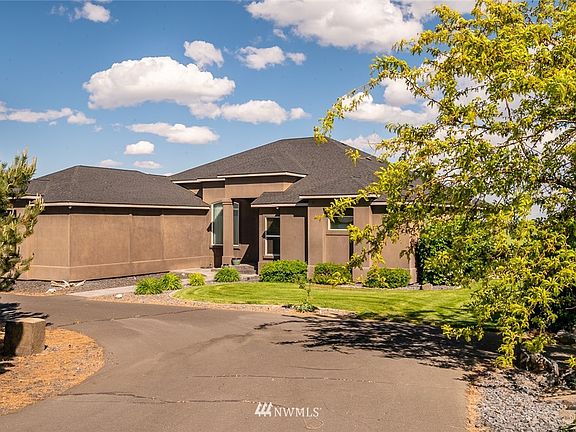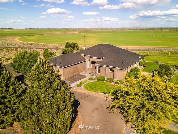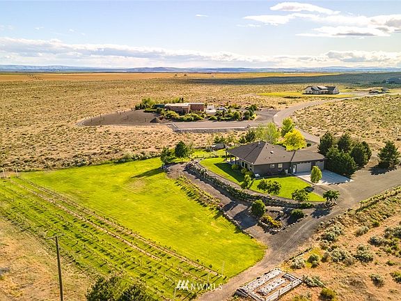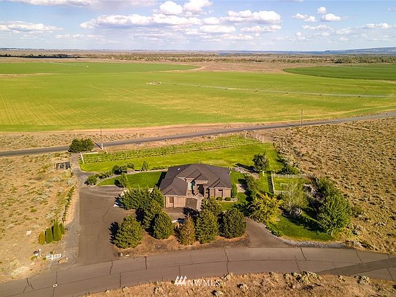 Welcome to Desert Hills. Amazing home w mini vineyard situated on a manicured 3+ acre lot in a gated community just west of Moses Lake. Designed to capture the stunning views from the open concept living area and covered patio. High end finishes include tall ceilings, mutliple french doors, crown molding and oversized windows throughout, making it easy to entertain with a gourmet kitchen and nearby wet bar nestled beside a double sided fireplace & leading to the large covered patio. Generous sized master suite with 5 piece bath, his & her walk in closets & French doors that access the patio. Den/office & 3 additional bedrooms make this home complete. Oversized 3 car garage. Beautifully landscaped w mature fruit trees & rock wall.