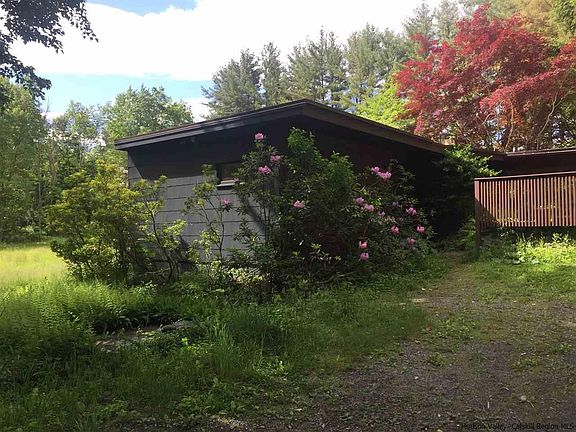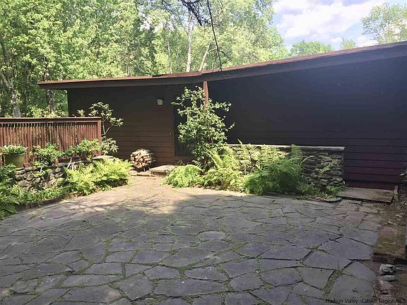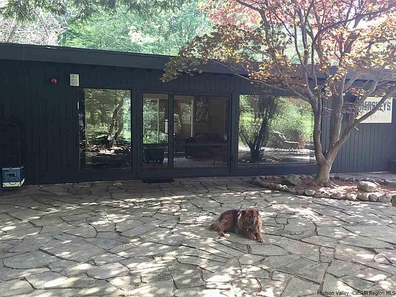 Calling all midcentury modern fans. This classic 1957 home has it all: two stylish bedrooms, two bathrooms (one off the master), a cute kitchen, dining room and an expansive light-filled living room, all on one easy-flow level. This secluded (but not remote) and authentic house has two bluestone patios - a courtyard outdoor patio in front and a quite large and totally private one in the back. The expansive and shady back patio sits just off the living room and has as its centerpiece a magnificent Japanese maple tree. Great indoor-outdoor flow for entertaining or quiet weekends at home. Classic architectural and design details abound, including a free-standing wood-burning brick fireplace in the living room, original kitchen cabinets, and the original sliding glass wall in the living room. Very desirable quiet country road with nice neighbors; close to town and shopping. The one-acre property is mostly meadow with very low upkeep. Plenty of room and lots of good sunlight for a pool or vegetable garden. This one's a gem, loaded with charm, style and coziness. Houses of this manageable size and distinctive style rarely come on the market.