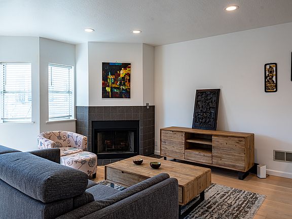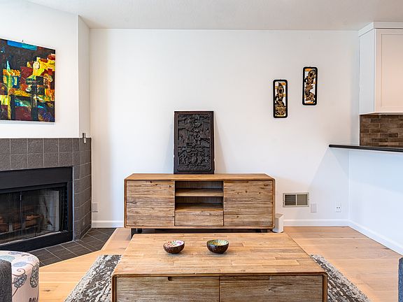 The south-facing public rooms are filled with natural light throughout the day and feature a fireplace, dining area, granite breakfast bar with highchairs, TV stand, coffee table, and a comfortable queen sofa bed. The two bedrooms are located at the rear of the unit for privacy. The primary bedroom offers a queen bed, dresser, and direct access to a bathroom with a bathtub. The second bedroom includes a double bed, and both bedrooms have closets and desks.