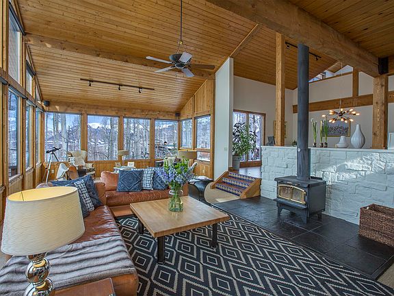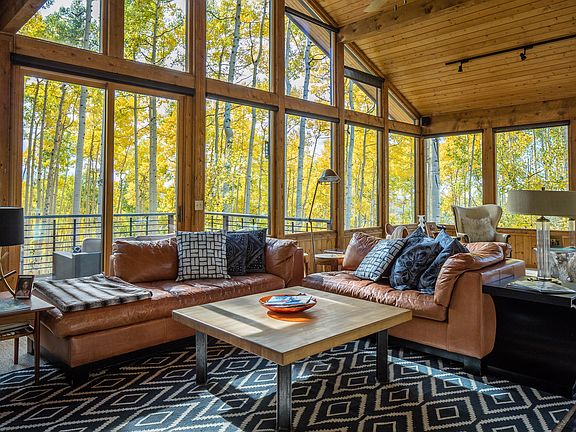 Arguably one of the nicest settings in the Ski Ranches is offered with this 5 bedroom, 4 bath residence on Canyon View Circle. Unrivaled privacy is enjoyed with the end of street cul de sac location. Relish sun drenched days under a natural canopy of aspen trees plus 180 degree mountain views spanning from mount Wilson to Emma Mountain and the San Sophia range. The generous 1.8 acre lot abuts 15 acres of open space, providing a natural haven for wildlife; additionally, a year round natural spring rounds out this idyllic setting. Inside the residence, savor the spacious layout and natural light from the abundance of glass. The 4,184 square foot offering will work perfect whether a year-round residence or vacation home with plenty of space for family and guests. Numerous decks and a wonderfully landscaped yard enhance family fun and outdoor enjoyment. Two additional structures could allow for a separate guest quarters, office, art studio, work shop.....currently the second, smaller structure has been converted to a fun kids' rock climbing space . Come and take a closer look at this fantastic regional value!