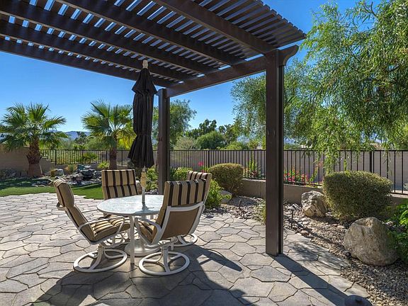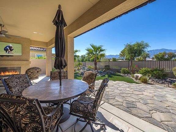 NEW PRICE! Welcome to luxury living in the 55+ resort-style community of Del Webb at Rancho Mirage! Discover your ultimate dream home with this highly upgraded and expanded Preserve model, boasting comforts tailored to your lifestyle. Step into a spacious open floor plan that seamlessly blends an elegant gathering room with a cozy fireplace and illuminated shelves, a generous dining area, and a stunning gourmet kitchen with a grand stone-topped island, counter bar with pendant lighting and above-cabinet lighting. Entertain and host festive dinners within this versatile living space! Experience true indoor-outdoor living with walls of glass that open up to an expansive covered patio, complete with motorized screens, a multi-color flame fireplace, a tranquil koi pond and breathtaking views of the majestic San Jacinto Mountains. Indulge in the oversized primary suite, featuring direct access to the outdoor oasis and a luxurious en-suite bathroom equipped with a spa-like soaking tub and a roll-in shower with a bench. Guests will luxuriate in the tranquil guest room and bath. The versatile front office/den with barn doors offers endless possibilities, easily transforming into a home gym or guest bedroom. This remarkable home is packed with upgrades, including luxury wood-look flooring, a speaker system throughout, water softening and filtration systems, a spacious laundry room with a utility sink, ADT security, a 2-car garage with golf cart space and leased Tesla Solar Panels.