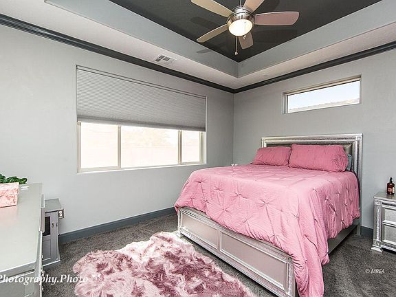 Immaculate home in Royal Vista, one of the most sought after communities in town. Gated and at the top of Mesquite. Owner has lived in home for just over 1 year, so it feels like a brand new home. Custom Knotty Alder Shaker style cabinets and custom 6 cm granite counter tops throughout. The kitchen is awesome and the pantry is huge. There is tile in the traffic areas & the showers are tiled with seat in master bath. The bedroom carpet is high quality with upgraded pad. Window coverings throughout with motorized roller shades. Refrigerator, washer & dryer stay. Garage floor was coated with epoxy. Garage has side door to area where you can store trash can. Water softener. Solar Screens on outside windows to reduce UV and provide more privacy. Fully landscaped and partially fenced with gates on both sides of home. The unique shape of this lot offers many possibilities. Plenty of room for pool. This home will not last with this quality at this price! There is a builder feature list available which will show you the quality of this home. Furniture package available outside of escrow.