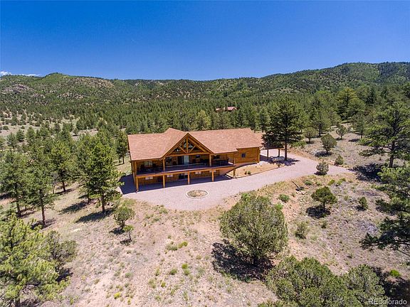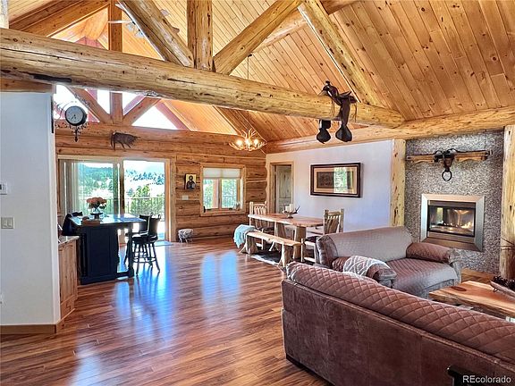 Magnificent full round log home sited on 78.35 acres in the well-respected Dilley Ranch nestled at the foot of Locke Mountain and a short distance to National Forest. No detail was overlooked in the recent remodeling of this 3,600 sf stunning home to assure easy living. An open concept design w/ 4 BDR ( 1 non-conforming) & 3 BA locations with the primary ensuite located on the main level. Magnificent beam accents catch the eye when entering. Engineered floors, picture windows and stacked stone gas fireplace spill into the dining area and gourmet kitchen, featuring granite countertops, Jennaire cooktop, built in oven, warming drawer. A sliding glass door offers easy access to a large, covered deck. Laundry with access to oversized garage and carport, office/flex space and ¾ bath complete this level. A fun place to gather friends and family is the newly remodeled lower-level game room with access to an outdoor patio, an impressive wine cellar, 2 bedrooms, and ¾ bath. An on demand/full house generator was installed in 2021. A 48 x30 barn with overhead doors, water and electric is an easy walk as is the pond and Oak Creek, which traverses this Classic Colorado horse property.