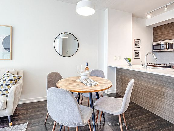 Welcome home to this south facing 1 bed + den at Emerald City 2. Over 650sf of open concept space w 9 ft ceilings. Entertainer's kitchen w quartz & stainless steel. Primary retreat w plush carpet & large closet space. 4 pc bath ft deep soaker tub and ample storage. Enclosed den w sliding barn doors is perfect for home office or as a 2nd bedroom. Enjoy clear views of the CN Tower from your oversized outdoor space. Ensuite laundry, locker & parking inc.