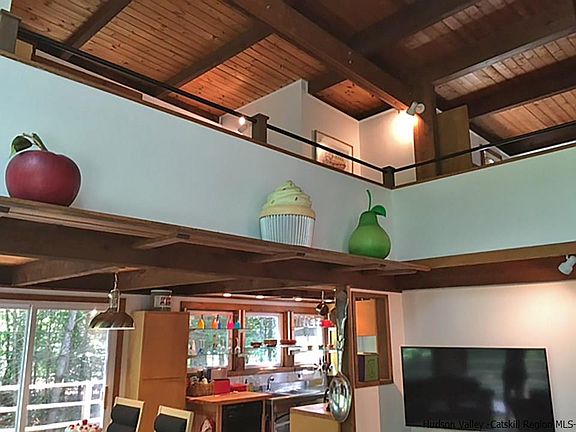 A country contemporary with wooded views everywhere! Located in uber-hip Saugerties and just over the border from Woodstock, this architectural gem is nestled on over 2 private and wooded acres with a perfect pond site. With angular lines and a stunning double height open floor plan, the warm wood beams and clean white walls enhance the drama while creating an inviting space. This is the perfect weekender or year-round home. The wall of windows in the main living area provides passive solar in the winter and lets the outdoors in year round while the eye-catching Swedish-style wood stove, a focal point, provides additional heat to the whole house. An industrial theme defines the cooks kitchen, with plenty of stainless steel and butcher block counters. Open shelving allows you to show off your Fiesta Ware or fine china. The dining area features sliding glass doors on two sides for easy access to the wraparound deck. The downstairs bedroom has plenty of closet space and can accommodate a queen bed. Just across the hall, a full bath features an enormous Jacuzzi tub. Upstairs, the dramatic loft bedroom has its own full bath, a cozy sitting area and office space. With beamed ceilings above and light flooding through the many windows, this is a cheerful, sophisticated retreat.