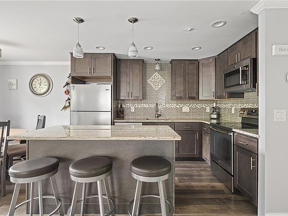 IMPECCABLY RENOVATED OPEN CONCEPT END UNIT. One of only a few units with an outdoor patio with spacious seating area. Other features include stylish gray hued solid wood cabinets, granite counters, large pantry unit, center island with pull out waste and recycling bins and room for seating in addition to dining area, full tile backsplash, stainless appliances, in unit laundry room. Newer gorgeous luxury plank flooring on first floor and wall to wall carpeting on stairs and second floor. 2 good sized bedrooms, 1 full and 1 half bath-both updated. Excellent storage throughout including bonus custom built overhead closet cubbies. 2 dedicated parking spaces plus guest parking area. Distant view of Narragansett Bay and Newport Bridge. Very easy access to Newport Bridge, Navy Base, shopping and downtown. Truly move in ready!