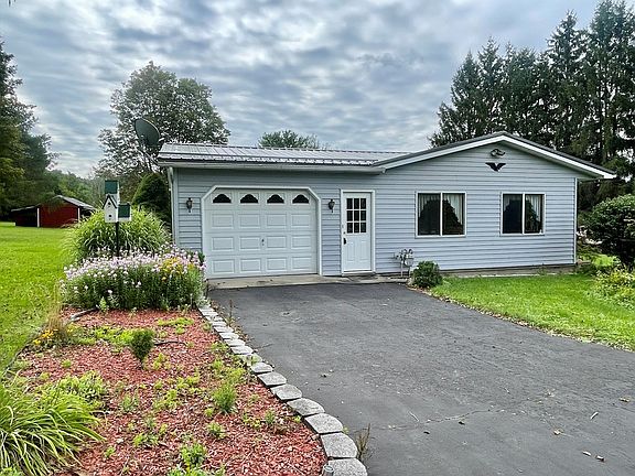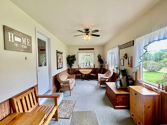 Charming single-story gem that offers the epitome of comfortable living. Step into the bright and inviting space w a remodeled galley-style kitchen seamlessly connecting to the dining room. The spacious living room bathes in natural light, creating a cheerful ambiance. With 3 bedrooms & 1 bathroom, there's room for everyone. Enjoy the enclosed sun porch for relaxation or the basement workshop for your creative pursuits, equipped w laundry & storage for convenience. The 1-car attached garage & paved driveway provide ample parking. Outside, a stone patio and 1.63 acres of yard space offer delightful outdoor living. A small barn with a lean-to and covered patio adds to the appeal. With a metal roof, replacement windows, natural gas heat, low taxes, and easy maintenance, this lovingly cared-for home is a must-see treasure. Listing Agent is a relative of the seller.