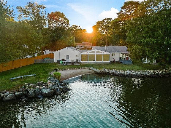 Welcome to your private, turn-key retreat on South Watuppa Pond! This serene home, accessed via an unpaved road, offers stunning water views and direct pond access. Arrive to a private fenced yard, a two-car garage, low-maintenance vinyl siding, and a newer roof. Inside, floor-to-ceiling windows frame breathtaking pond views. The open-concept kitchen features stainless steel appliances and a peninsula with seating, flowing into the dining area and living room with a cozy wood stove. Relax in the sunken leisure room with a pool table. The primary suite includes a private deck overlooking the pond, with two additional bedrooms and a second full bath providing ample space. Enjoy central AC, a laundry area, and two sheds for storage. Outside, unwind on your private beach and expansive, beautifully landscaped lawn—perfect for outdoor activities. South Watuppa Pond, spanning 1,460 acres with depths up to 23 feet, offers endless waterfront fun!