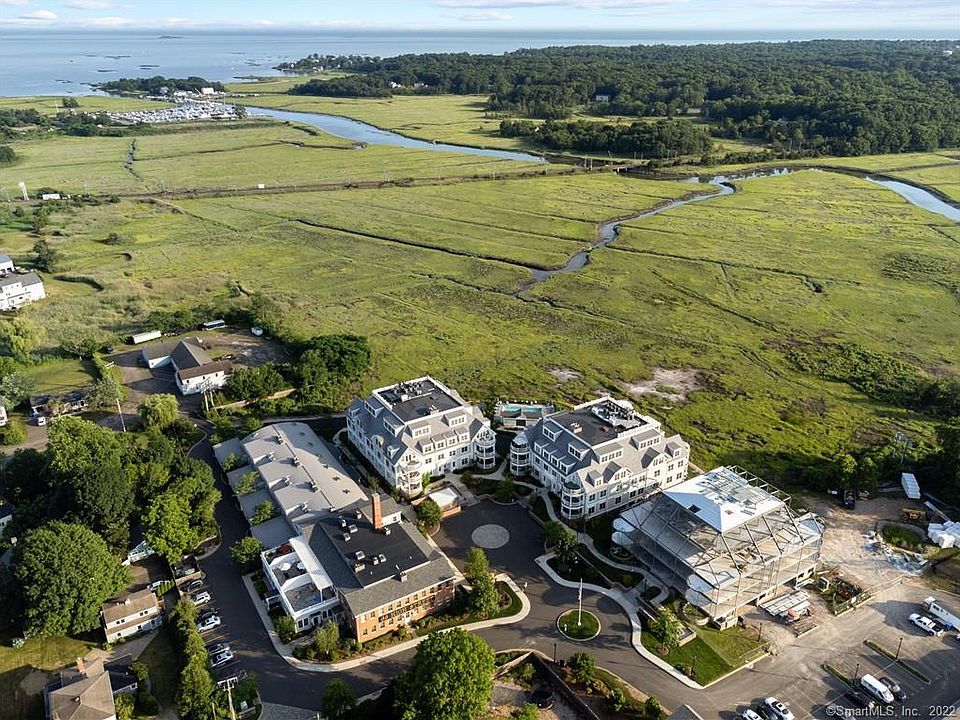 Enjoy living on the CT shoreline in the historic Mill Building at 66 High Street Residences ~ a luxury complex overlooking marshes and LI Sound. This townhouse is within walking distance to the town green, shops/restaurants, Jacobs Beach, the marina and train station. The first floor consists of an open floor plan with a gas fireplace in the living room, custom shelving, hardwood flooring, 12' ceilings, dining room, kitchen island with seating, quartz counters, sub zero, Wolf gas range, full bath and bar area with wine chiller and laundry located in the mechanical room. The second level has a large walk in storage room at the top of the wood and metal staircase. A full hall bath with double sinks and large guest bedroom with a walk-in closet and a built in desk with shelving. The primary bedroom suite has 12' ceilings, large custom finished closet and ensuite bath with double sinks and heated flooring. The unit has LED lighting, prewired for three zone whole house audio, and has a dedicated parking space as well as a detached garage with storage cabinets. Condo complex amenities include in-ground pool, fire pit sitting area, dog park, community vegetable garden and fitness center. Conveniently located within 90 miles to NYC.