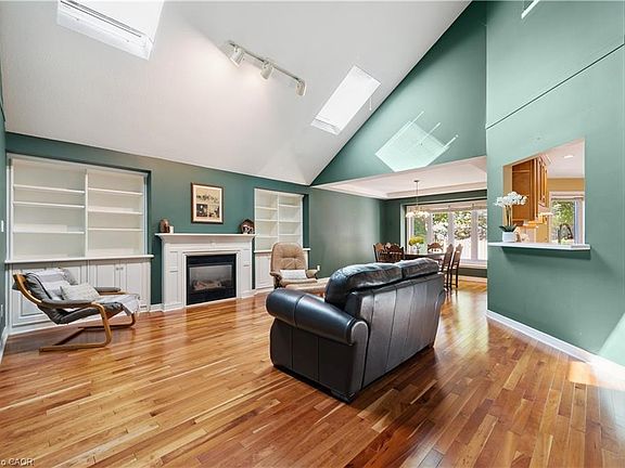 Welcome to this beautifully maintained bungaloft in Guelph's highly sought-after Kortright East neighbourhood - where comfort, functionality, and charm come together seamlessly.The main floor offers a bright and spacious layout featuring two bedrooms, including a primary suite with a walk-in closet and private ensuite bathroom. A second bedroom with its own 3-piece bath provides flexibility for guests or family. Enjoy the ease of main floor laundry, vaulted ceilings with skylights, and a cozy gas fireplace that anchors the sun-filled living room.Downstairs, the finished basement extends your living space with two additional bedrooms, a den, office, and a 2-piece bath with shower rough-in-perfect for a growing family, home business, or multigenerational living with separate basement entrance through the garage. Ample storage throughout ensures everything has its place.Step outside to a private backyard surrounded by mature trees, ideal for relaxing or entertaining. A double car garage and spacious driveway complete this exceptional property.Located in a quiet, established community close to parks, trails, top-rated schools, shopping, and transit, this home offers the perfect blend of tranquility and convenience.