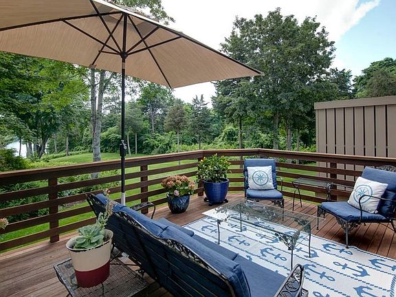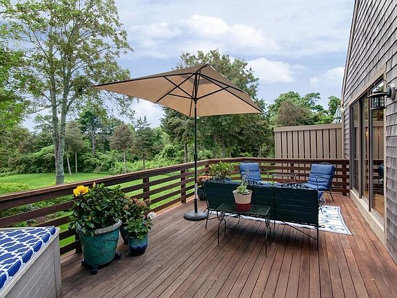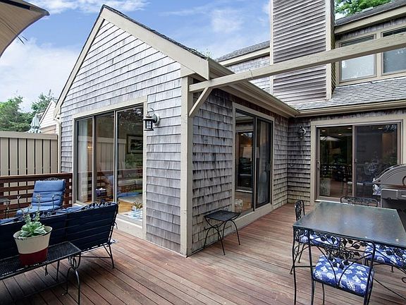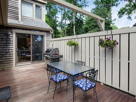 Treetops Condominiums in Falmouth offering tennis, swimming pool, clubhouse, walking trails, dock, and a membership to Quissett beach on Nantucket Sound. This beautiful, private end unit has water views of Oyster Pond that begin at the front door. There are 3 finished floors of living space, an open floor plan, cathedral ceiling in living room, a 1st floor bedroom, a 1st floor full bath with laundry, 2 fireplaces, wrap around mahogany deck, and many upgrades. Eat-in kitchen with stainless appliances, Corian counter tops, built-in cabinets, and slider to deck. The living room is a spacious sun-filled open area with hardwood floors, fireplace, formal dining area, fabulous water views, and slider to expansive wrap around mahogany deck. Second floor the Master Suite with private bath, walk-in closet, and sitting area with fireplace. A second floor guest room with private bath. The walk-out lower level is finished with office space, family room, full bath and wet bar.