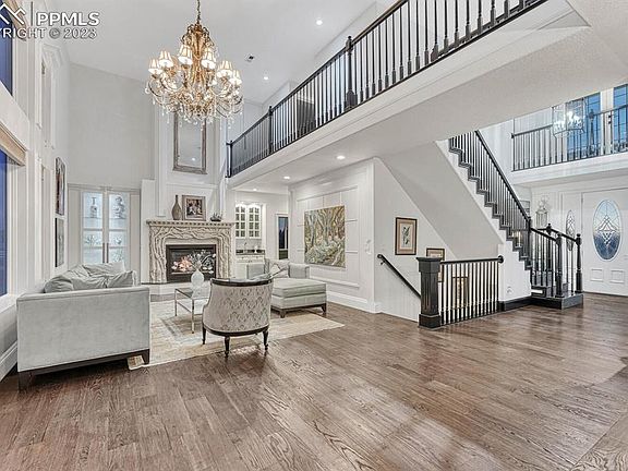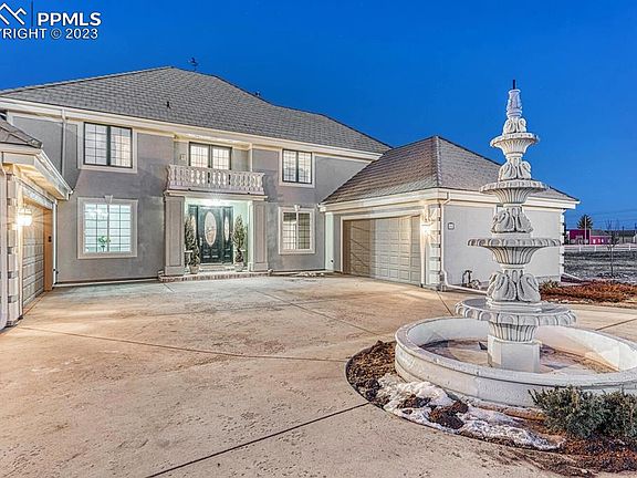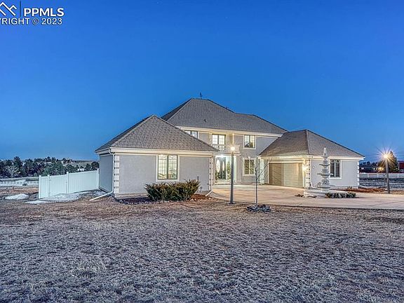 Luxury in Franktown! Incredibly upgraded estate home on over 9 acres! NO HOA! Bring your RV, Camper, ATV’s or have animals. Zoned to have almost any animals you could want. Live your life your way! New paint inside & out, new fence, mostly new windows on main floor, sunrises in your eastern view to mountain view sunsets in the west with peace, quiet & plenty of wildlife. The large back deck with bench is sure to please as you look over the expansive completely fenced property. Make a grand entrance through a covered front porch with 2nd floor outdoor balcony above. Wide plank hardwood throughout most of the main floor with a majestic chandelier fixture in the soaring ceiling to light the way to the family room where a gas log fireplace sits amidst a wet bar area & lighted glass enclosed built-in cabinets. Globe pendant lights showcase the newer kitchen cabinets & quartz island that overlook a small breakfast area with bay windows. Stainless steel Jenn Air, Bosch and Viking appliances for the most discerning chef, walk-in pantry & beverage refrigerator. Oversized formal dining room that includes a trey ceiling with crown molding & high baseboards to enhance the ambience of any meal. An office with wood beam ceiling as well as a bedroom with trey ceiling & ensuite bathroom add to the convenience of the main floor, as does the half bath & laundry area. Now make your way to the upper floor to experience the spectacular primary bedroom complete with vaulted beamed ceiling, skylight, sitting area, walk-in custom closet system & luxurious five piece primary bath with heated floors, ceiling fan/speakers & a digital shower system. A full bath & 2 additional bedrooms (one with walk-out balcony) round out the upper floor. Large basement with TWO water heaters, a partially finished theatre room as well as additional unfinished areas & is also stubbed for additional bath option should you so choose to finish out the lower level.