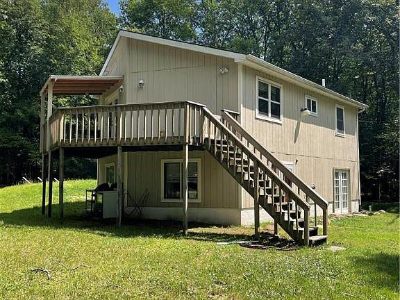 Escape to your slice of mountain paradise in this cozy retreat nestled among the hardwood and pine trees. Designed with comfort in mind. Recent renovations include and full tile bath and kitchen. The newer updated kitchen is accented with a wood like plank floor, cathedral ceiling, recessed lighting, ceiling fan, and newer appliances to enjoy. Take your meals to a partially covered deck from the kitchen dining area and watch the wildlife. The MSBR is very large since two bedrooms were combined. Now there are only two bedrooms unless the buyer created a first floor bedroom to make it three bedrooms again. However, this home awaits some first-floor finishes for its next owner. You can customize the finishing touches to your liking. Two good sized rooms on the first floor could be a game room bedroom, and giant family room with a future PR. There is also a roughed-in plumbing hookup for a future powder room. The washer, dryer, refrigerator, pellet stove, riding lawn mower, and uninstalled wood stove are included in “as is” condition. Also included are some uninstalled cabinets. The entire home is being sold AS-IS condition and personal items are currently being removed from the house.
