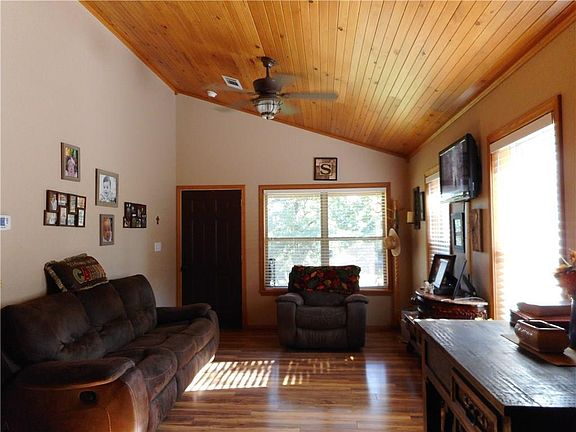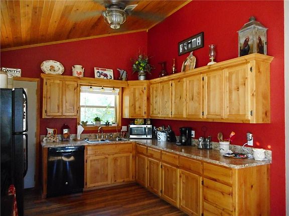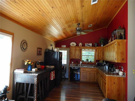 Nestled in the Woods. This unique, cozy, custom home is only 3.4 miles from downtown Booneville. 4.9 wooded and cleared acres. Wonderful place to live or have as a getaway. Designed for peace and quiet..who wouldn't love sitting on this front porch. Beautiful sloped stained wood ceilings throughout...and cabinets that are absolutely stunning.