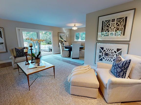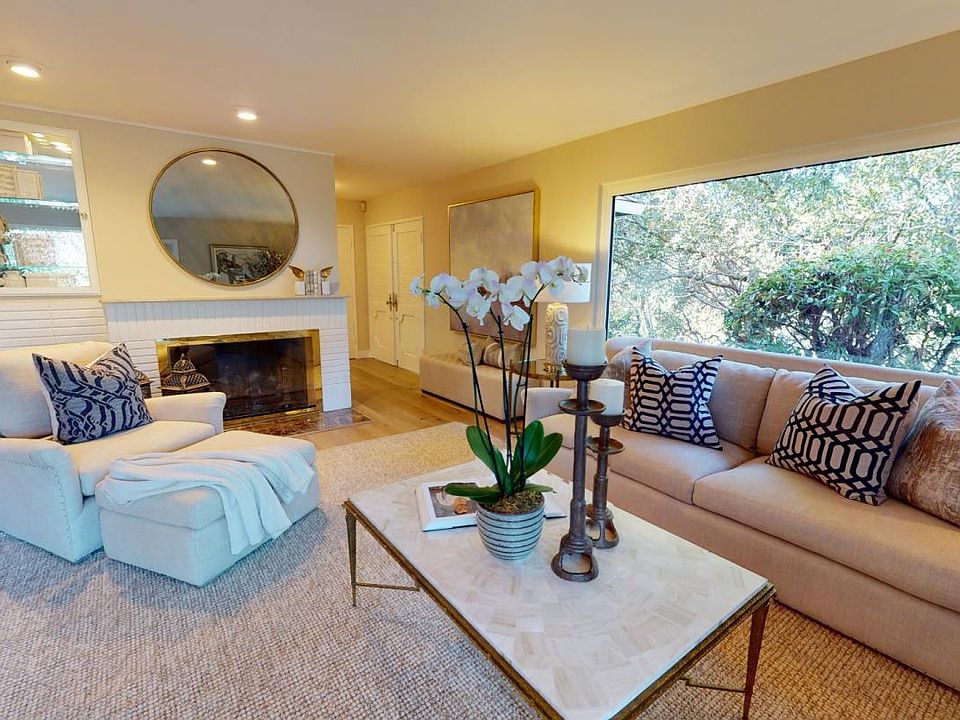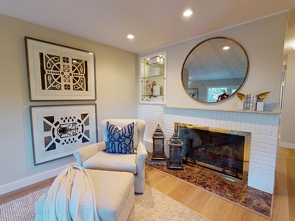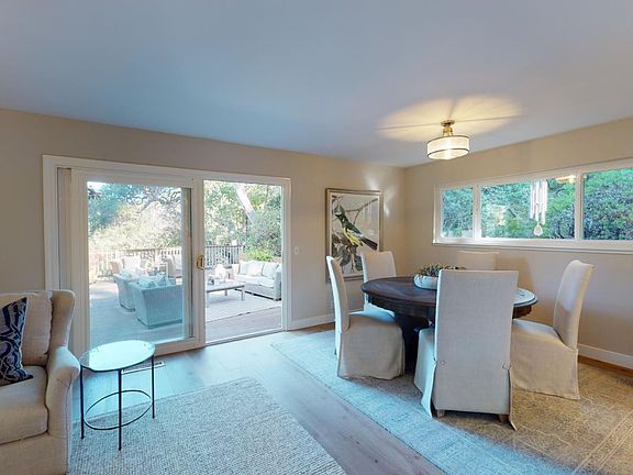 Gorgeous home in serene setting with expansive decks off LR, DR and FR for indoor-outdoor lifestyle. One-level home has private wooded lot. Picture windows in LR and Main BR. LR w/fireplace and dining area. Well-appointed kit. w/granite counter tops open to FR w/Thermador cooktop, double oven, warming drawer, Sub-Zero refrigerator, Miele dishwasher. FR w/dramatic raised brick fireplace with built-in cabinets. Large skylight. Floor plan flows easily to hallway with multiple storage closets. Spacious Main BR suite w/double closets, separate linen closet, marble sink countertop and stunning walk-in shower. Nestled in the trees, this home offers privacy and contemporary living. Newly painted inside and out. Newly installed engineered white oak floors. Laundry room doubles as home office with built-in desk, bookshelves, and file cabinets. Upper yard area has view of hills. Minutes to thriving downtown San Mateo, great restaurants, Caltrain and SFO. Great San Mateo Schools.