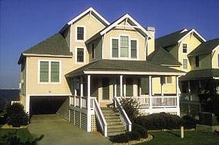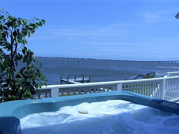 Pirate's Cove Resort, Manteo NC.Soundfront. Non smoking, No pets, 4.5 Bedroom, 3 Bath, Sunday. Accommodates 12. 3Q, 3T, 3 RAWs. Private hot tub on deck overlooking Roanoke Sound (4/15-1/1). 30' of dock space located at Ballast Point Canal #68. Covered parking for boat or jet ski trailer. Private dock and pier on Roanoke Sound. Soundfront master bedroom with Queen bed and Jacuzzi tub plus private balcony with furniture, 2nd and 3rd bedrooms with Queen beds, 4th bedroom with 2 twins, bonus room with twin bed, 3 roll-away beds for use in property, 5 TVs, 5 VCRs, DVD , stereo with CD player, Nintendo game system, port-a-crib, gas fireplace, gas grill, 2 bicycles, ceiling fans, covered deck with furniture. Panoramic view of Roanoke Sound. Parking for 4 vehicles maximum