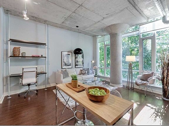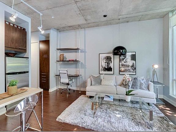 Welcome To 66 Portland, One Of The Best Boutique Lofts @Prime King West Steps To All The Action,World Class Shops,Restaurants & Nightlife. Open Concept Soaring 10 Ft Exposed Concrete Ceiling & Columns Dark Laminate Flrs, Bright South Facing Flr-To-Ceiling Windows Looking Out To Tree Lined Quiet Street Sleek,Trendy,Full Of Character.Custom Built-In Closet Organizer,Desk,Tv/Media Shelving Units Incl.Tenant To Pay Hydro & Cable/Internet.Spotless & Move In Ready!