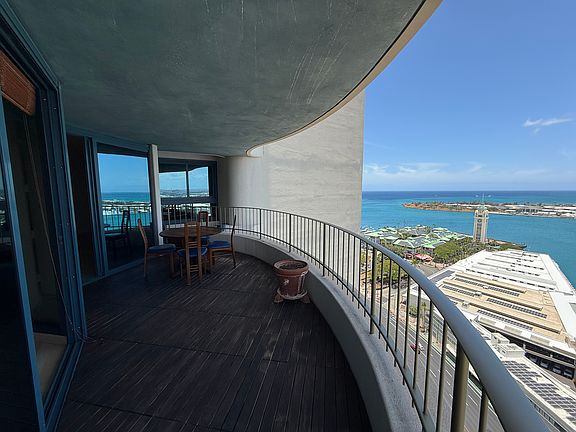 Convenient 29th floor downtown unit with ocean, sunset, Aloha Tower, Honolulu Harbor and airport views. 2 bedrooms/2 baths, 1253 sq ft not incl. lanai, one std size parking in garage. Many restaurants and Chinatown within walking distance. Teak lanai flooring, stainless steel appliances (incl. microwave), induction cooktop, range hood, convection oven, Bosch top- of-the-line dishwasher (almost silent), washer/dryer in unit, walk-in rain shower and Toto Neorest bidet toilet in master bath, custom travertine in both bathroom floors/walls, laminate floors, and central a/c. Amenities include a salt water infinity pool, jacuzzi, and gazebo with ocean views, 3 gas grills, gym/workout room, conference room, large common living room, high speed Internet, cable TV and water/sewer. Only 5 apartments per floor, so amenities are uncrowded. Small pets acceptable. One year lease, first month's rent, security deposit, and refundable pet deposit (if applicable) due at signing. Renter pays for electricity (based on usage) and air conditioning (chilled water fee based on usage). Landlord pays for water (incl. hot water), sewer, high-speed Internet (w. wifi) and basic cable TV w. 1 DVR, quarterly a/c maintenance (incl. air filter replacement), semi-annual pest treatment (if needed). No smoking allowed. Up to 2 cats and one small dog allowed. Tenant is responsible for maintaining the fixtures, appliances and general cleanliness of the apartment and immediately informing the landlord of any problems with fixtures/appliances, water leaks or water intrusion. Tenant must abide by the condominium bylaws and rules.