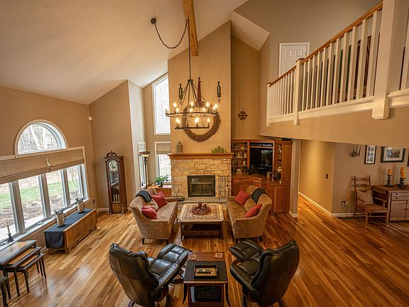 This Classic Contemporary is spacious and bright. Great for family and friends to gather. The large Living room is open to the Dinning Room and Kitchen. Cherry floors through out the first floor. Living Room has a cathedral ceiling, stone wood burning fireplace and built-ins . The Dining Room leads to a private deck which overlooks the professionally landscaped back yard. A Cooks’ kitchen with new appliances, a gas cook top and pantry. The 3 season room with gas stove makes for a cozy get away. The first floor master bedroom en suite with walk-in closet. Laundry and half bath make for one floor living. Second floor: Light filled loft, 2 bedrooms, 2 baths. Lower Level is unfinished with a bath plumbed in for future renovations. All house generator, central Air Conditioning and a 2 car attached garage.