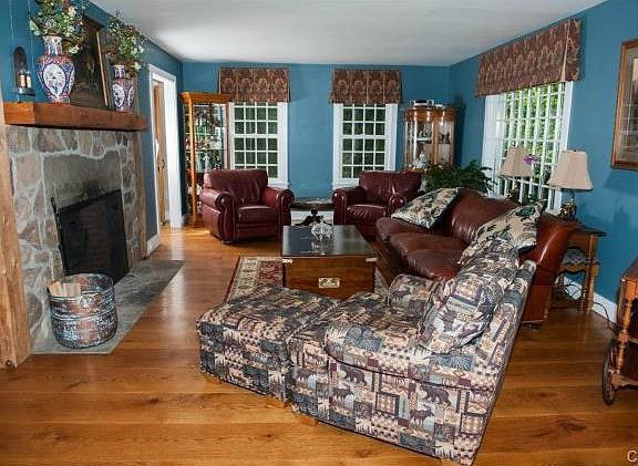 Country estate with the finest quality and craftsmanship throughout! A builders own home with many reproduction features including cedar shake roof, 12 over 12 Simulated Divided Light windows, wide board oak and pine flooring, copper gutters, center masonry fireplace and beamed ceilings. A pristine home on 25 acres of seclusion with barn, 2000 square feet of blue stone terrace bounded by stone walls overlooking grounds and seasonal views. Other amenities provide professional landscaping, plenty of room for pool or guest home and expandable walk out lower level with brick fireplace, finished office and full bath.