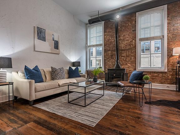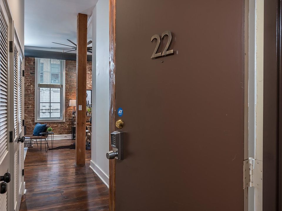 Stunning second-floor unit with tall 12' ceilings and large south and west-facing windows, offering an abundance of natural light. Features include exposed brick, original wood floors, updated kitchen with shaker cabinets and glass subway tile and new extra large ceiling fans in living and bedroom. Enjoy the convenience of being within walking distance to everything downtown, including the future home of the Brooks Museum of Art across the street. Don't miss out on this incredible opportunity!