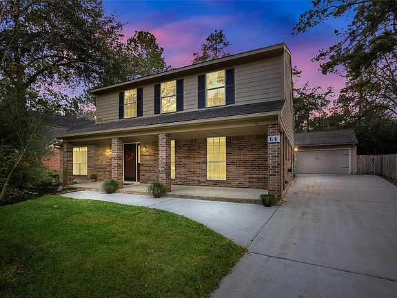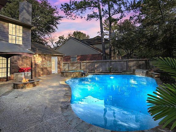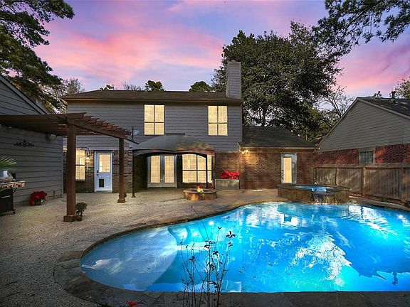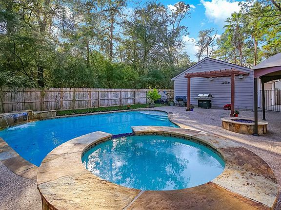 Wow! Excellent home in The Woodlands with large pool, fire pit, rear green belt and great location! Backyard oasis on private greenbelt complete with sparkling pool, spa, pergola & fire pit! New HVAC 2018. Primary bedroom downstairs! Charming front porch and large, inviting driveway and front walk welcome you to this 4 bedroom, 2.5 bath home in the quiet enclave of Hidden View in Golden Sage. Main bedroom is a peaceful retreat with vaulted ceilings, laminate floors and en-suite bathroom with double sinks and large, walk-in shower. Upstairs you will find a large gameroom with a built-in screen and projector perfect for movie night and tons of storage for games and toys. Upstairs is an additional 3 bedrooms and a full bath with double sinks and mirrored medicine cabinets. Neighborhood pond great for fishing and bird watching is just steps away and neighborhood park is just a short walk! Zoned to exemplary Galatas. Quick I-45 access. also full RV Hookup and a Pool Guard Safety Fence.